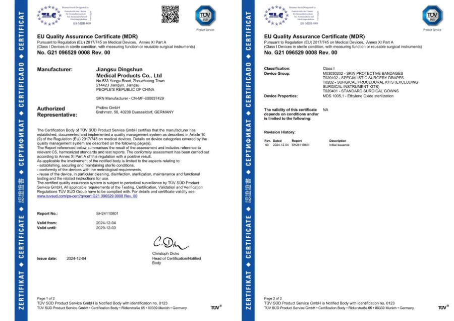 حصلت Dingshun Medical الآن على العديد من الشهادات الدولية بما في ذلك CE وMDR وFDA وISO13485 وISO9001.